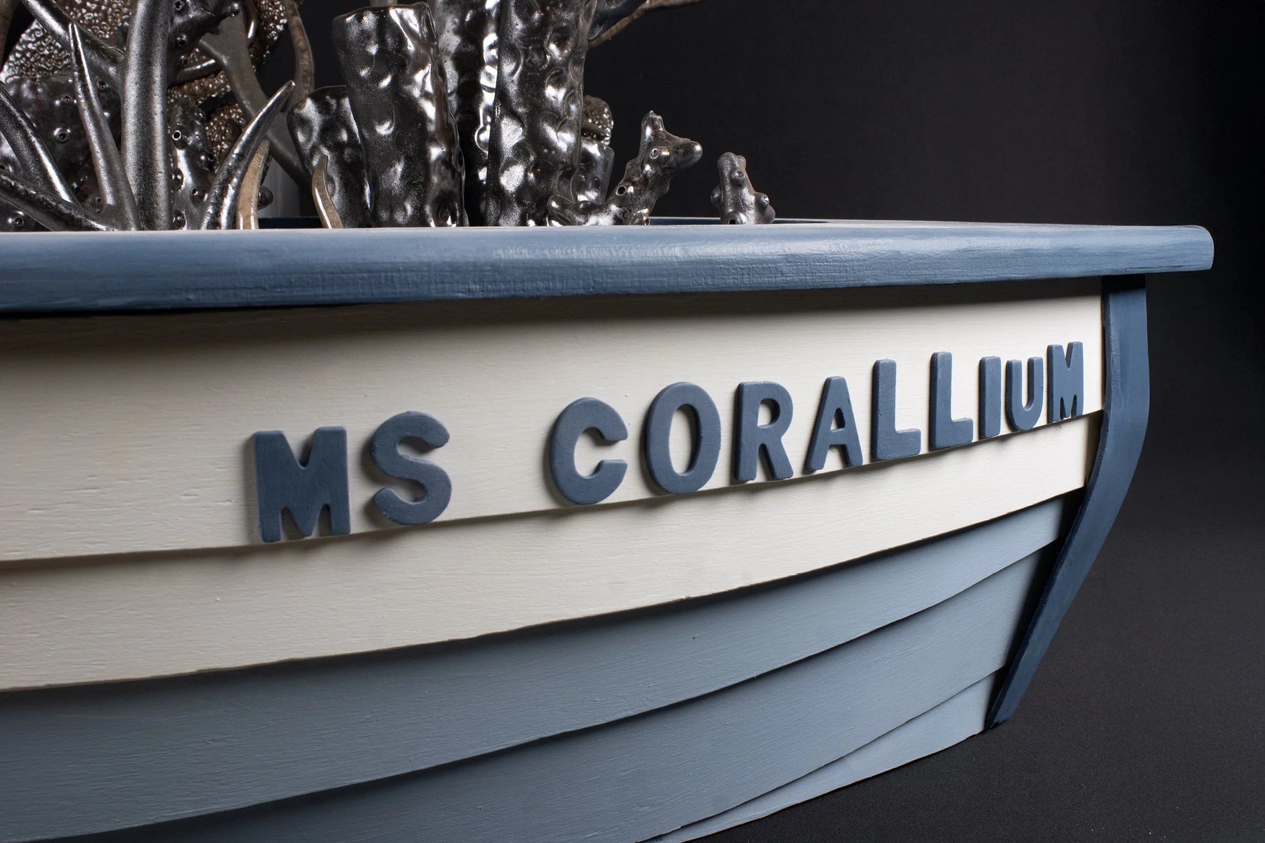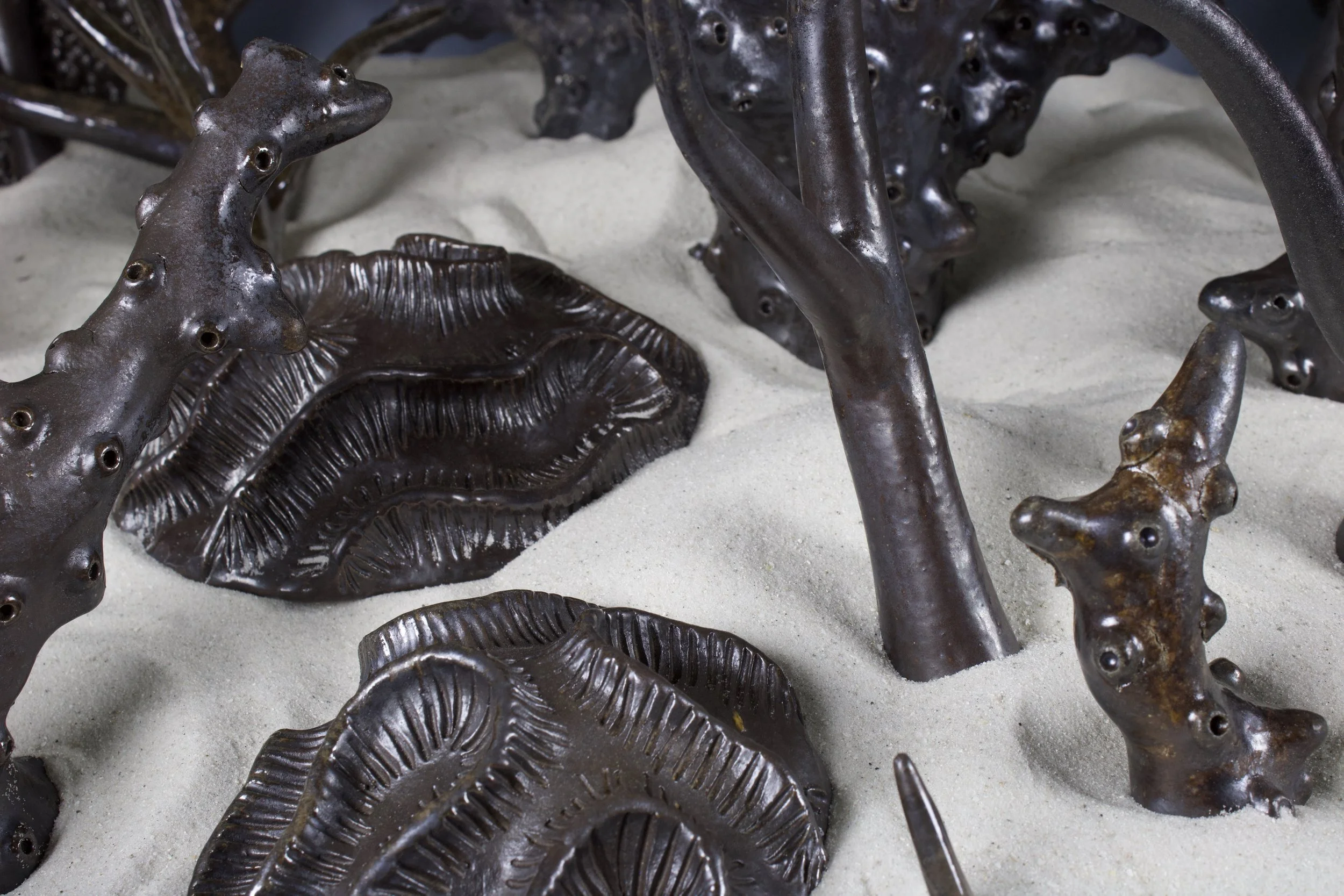 Wood fired, soda fired, and salt fired coral sculptures placed on sand in a wooden boat.