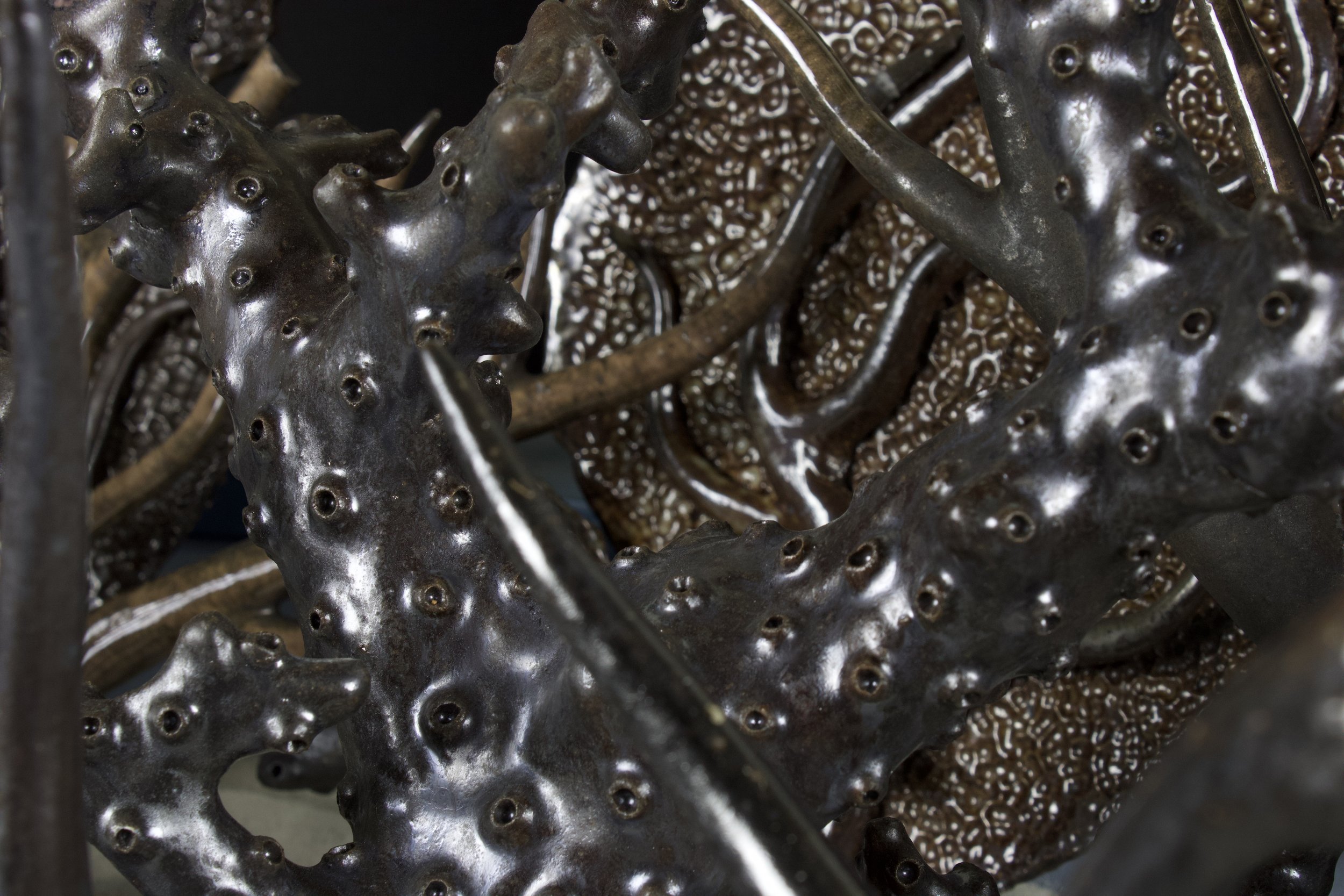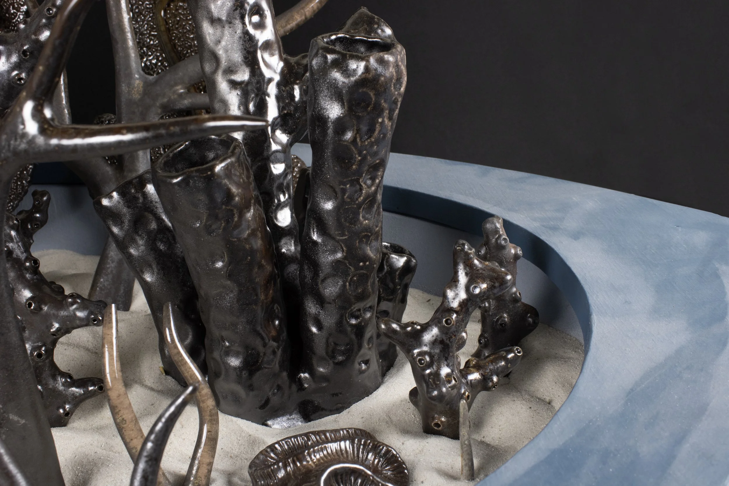 “M.S. Corallium", Wood Fired Stoneware, Wood, Sand, Acrylic, Fabric, 42”x23”x23’, 2025